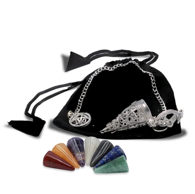 Pendule lumineux et très raffiné avec 7 pierres semi-précieuses afin de travailler sur la thématique des chakras.